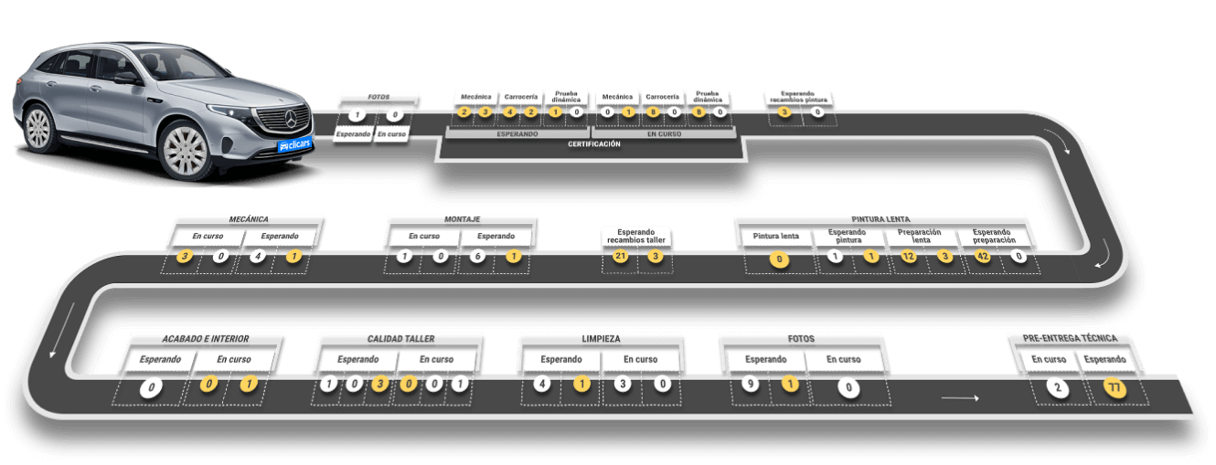 En nuestro proceso de certificación, de casi 2 horas, revisamos 320 puntos de control de cada uno de nuestros coches. Utilizamos una máquina de diagnosis y realizamos pruebas dinámicas para detectar averías, ruidos y vibraciones por lo que ¡no se nos escapa nada!. A continuación, hacemos las tareas detectadas en la certificación, a través de un completo flujo de reacondicionamiento en nuestras fábricas con tareas de mecánica, carrocería, montaje y acabado, calidad y limpieza.